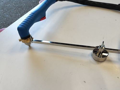 ①トーチ先端のカップを円切りコンパスの先端にセットしします。