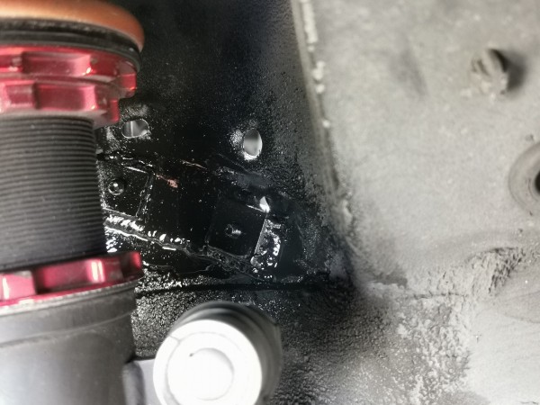 フレーム側は厚みが1mmしかなく手こずりながらも、穴が空くことなく溶接できました。あんまりキレイじゃないですが。。タイヤハウス内狭かったのでしょうがないという事にしておきます(開き直り)。