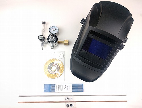 に加えて以下の内容(写真3枚目※自動溶接遮光面は選択式です)が付属されており、他に電源100V、アルゴンガスボンベ、革手袋、グラインダーがあればすぐに溶接ができます。